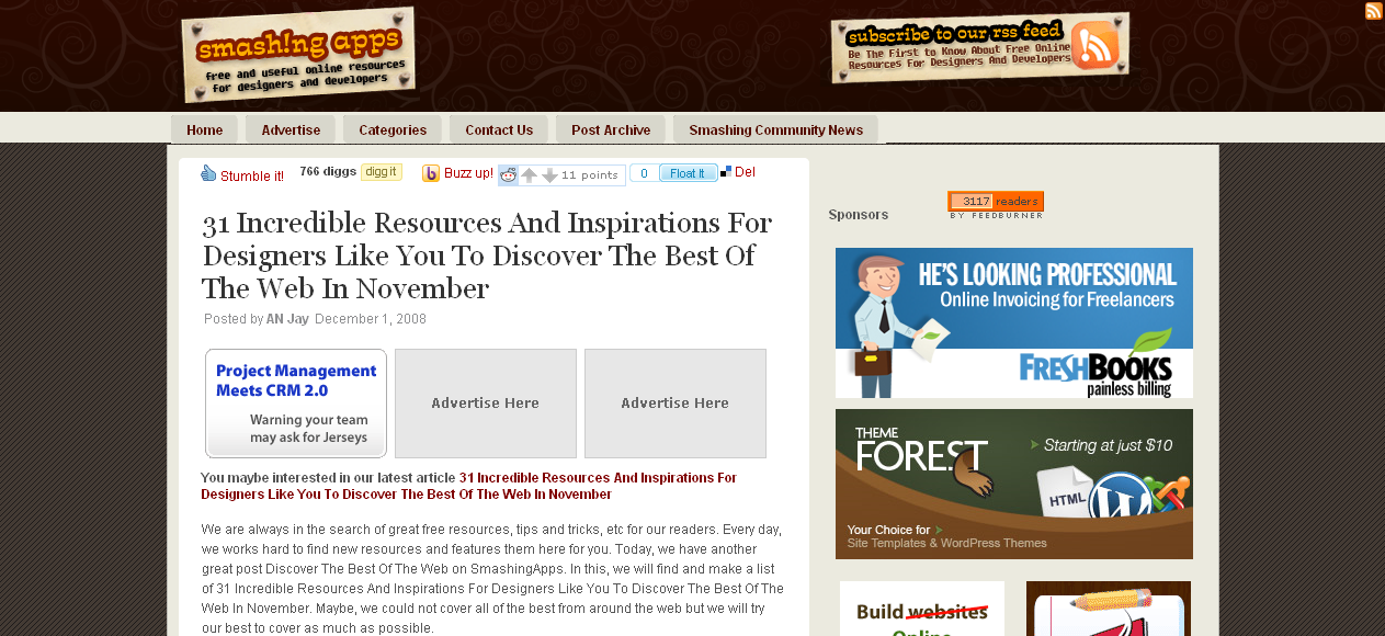 La gente de Smashing Magazine trabajan bastante bien los recopilatorios. En este caso tratan sobre una lista de recursos donde puedes encontrar tutoriales de diseño, imagenes para inspirar, tipografías gratuitas, trucos para programación web (Ajax, Javascript, xHTHML y CSS ) y otros artículos relacionados.